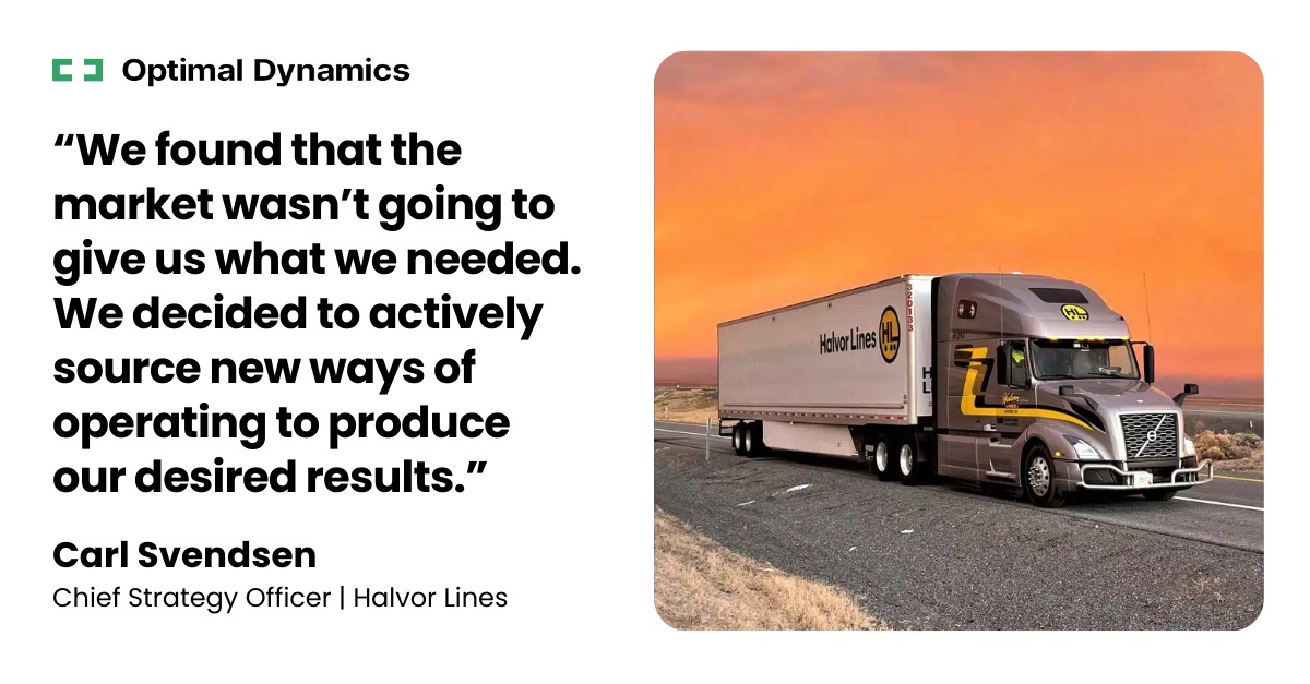 Halvor Lines is among the enterprise carriers that use Optimal Dynamics and McLeod in tandem. Today’s challenging freight market was one of the primary drivers of the organization’s decision to adopt decision automation. As Carl Svendsen, Chief Strategy Officer at Halvor Lines, put it: